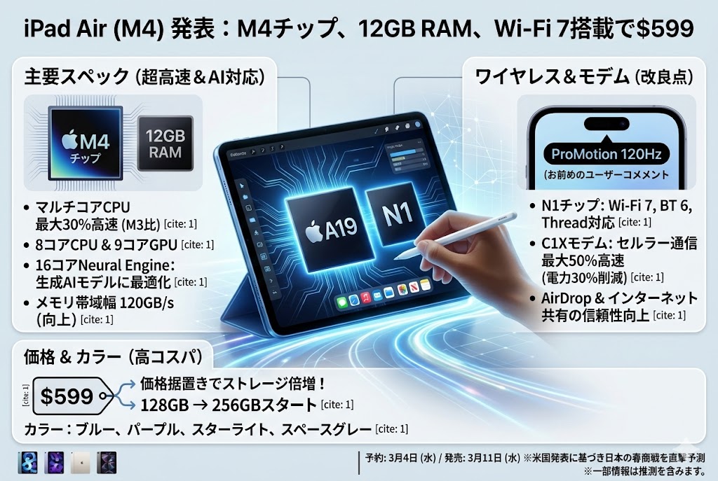 アップル、iPad Airを発表。M4チップ、メモリ増設、Wi-Fi 7などを搭載