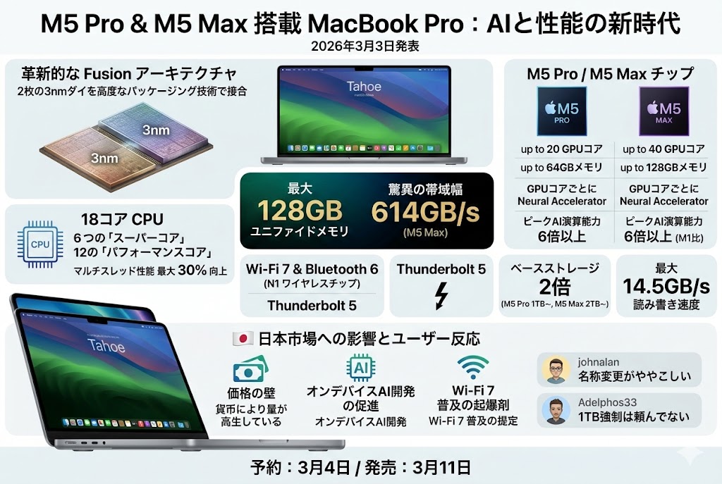 アップルは新しい「Fusionアーキテクチャ」を採用した、M5 ProおよびM5 Maxチップ搭載の新型14インチ・16…