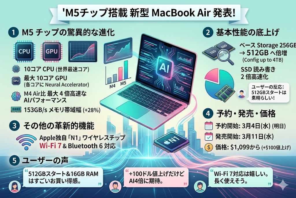 Apple、M5チップと512GB SSDのMacBook Airを発表