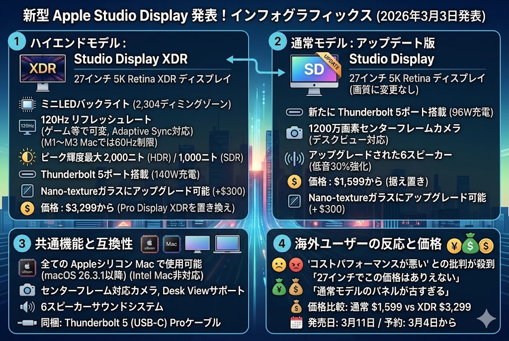 Appleは、従来のPro Display XDRの後継となる「Studio Display XDR」と、通常版「Studio Display」のマイ…