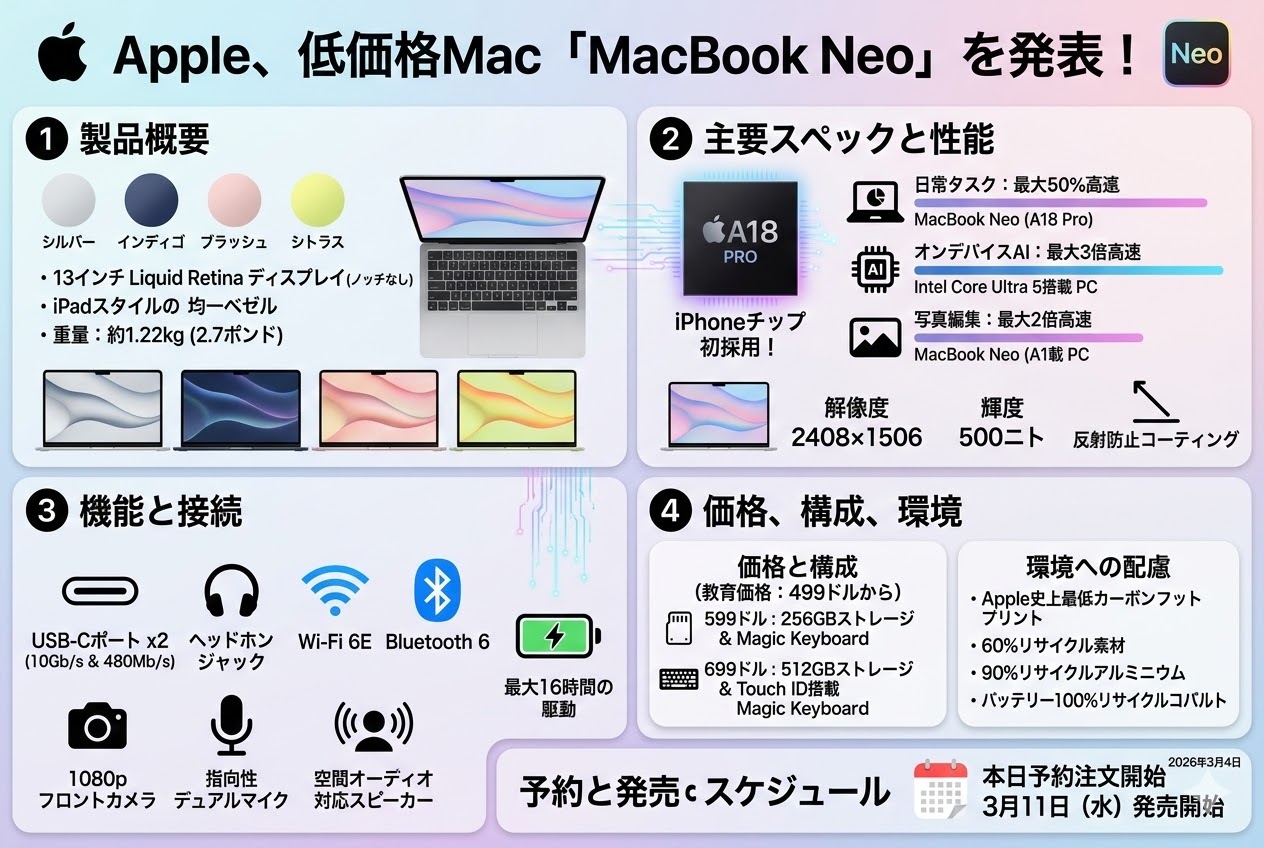 アップルは本日、A18 Proチップを搭載した全く新しい種類の低価格Mac「MacBook Neo」を9万9800円で発表し…