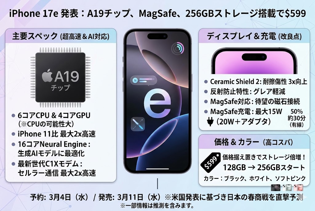 アップルは本日、A19チップ、MagSafe接続、より高速な充電などを搭載した「iPhone 17e」を発表しました。 …